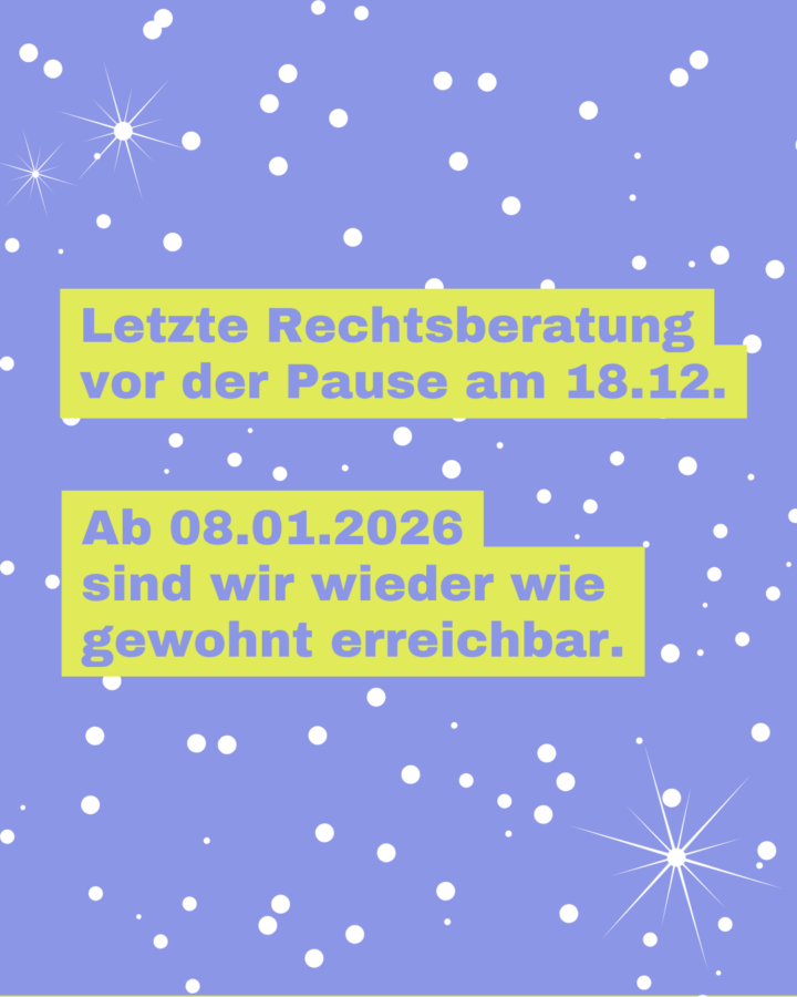 Letzte Rechtsberatung vor der Pause am 18.12. Ab 08.01. sind wir wieder wie gewohnt erreichbar.