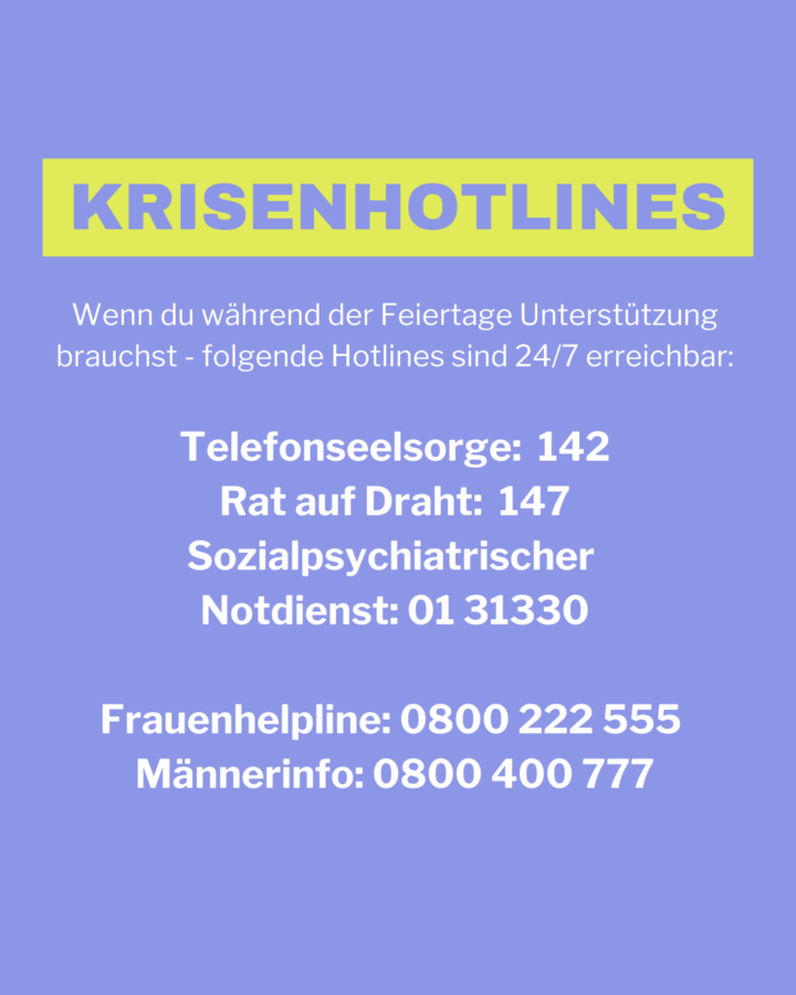 Wenn du während der Feiertage Unterstützung brauchst – folgende Hotlines sind 24/7 erreichbar: