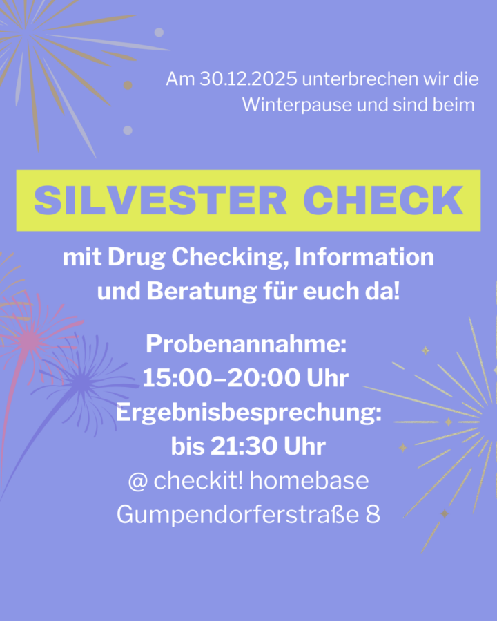 Am 30.12.2025 unterbrechen wir die Winterpause und sind beim Silvester Check mit Drug Checking, Information und Beratung für euch da!